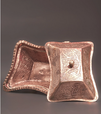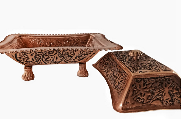 The Copper Butter Box by KK (Kashmir Krafts) is a beautifully handcrafted storage container made from pure copper, designed to store butter in a traditional and hygienic way. It combines utility with elegant Kashmiri craftsmanship.