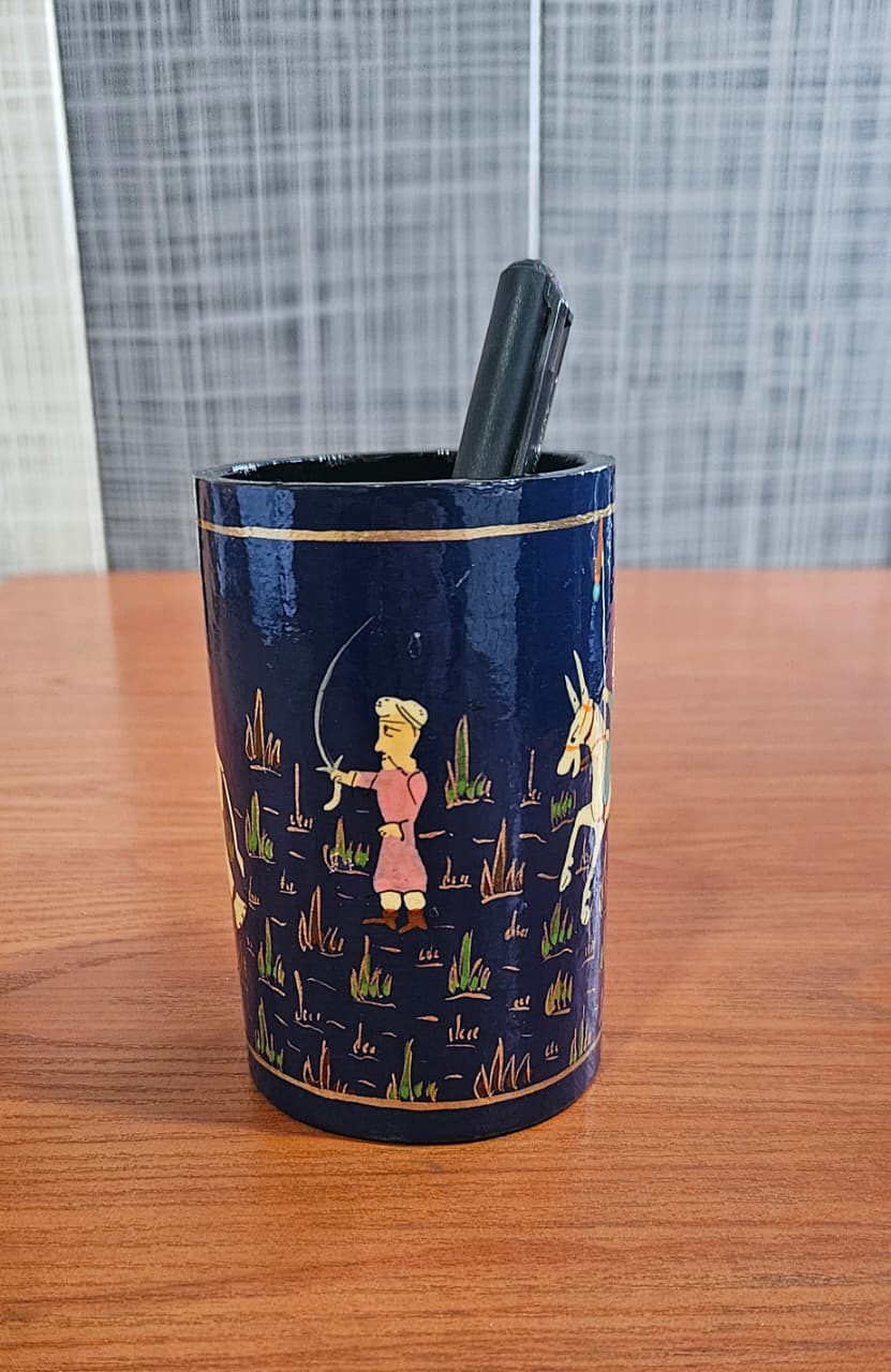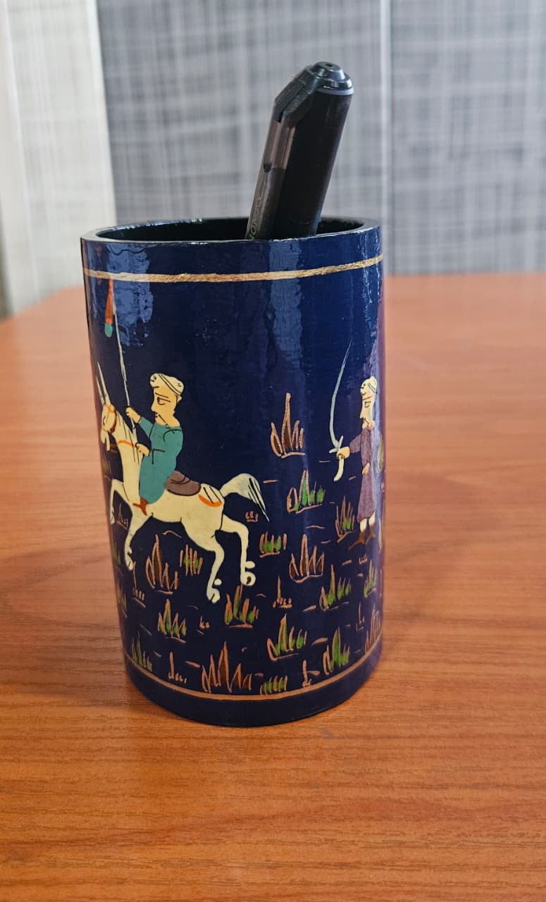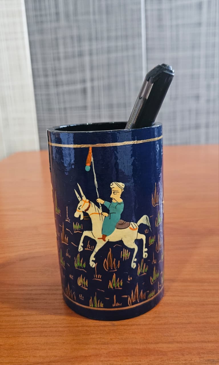 This lovely pen stand has been hand painted by Kashmiri artists drawing inspiration from their beautiful legacy of art. The Papier-Mache art form originally from Persia, was initiated in Kashmir with the art of paper making and writing in the 15th century, during the reign of Badshah Zain-ul-Abedin in Kashmir. Totally hand made with beautiful painting